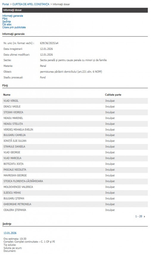 Mai precis, potrivit Portalului Instanțelor de Judecată, este vorba despre dosarul cu indicativul 639/36/2025/a4, înregistrat luni, 12 ianuarie 2026, care are ca obiect permisiunea părăsirii domiciliului (art.221 alin. 6 NCPP).