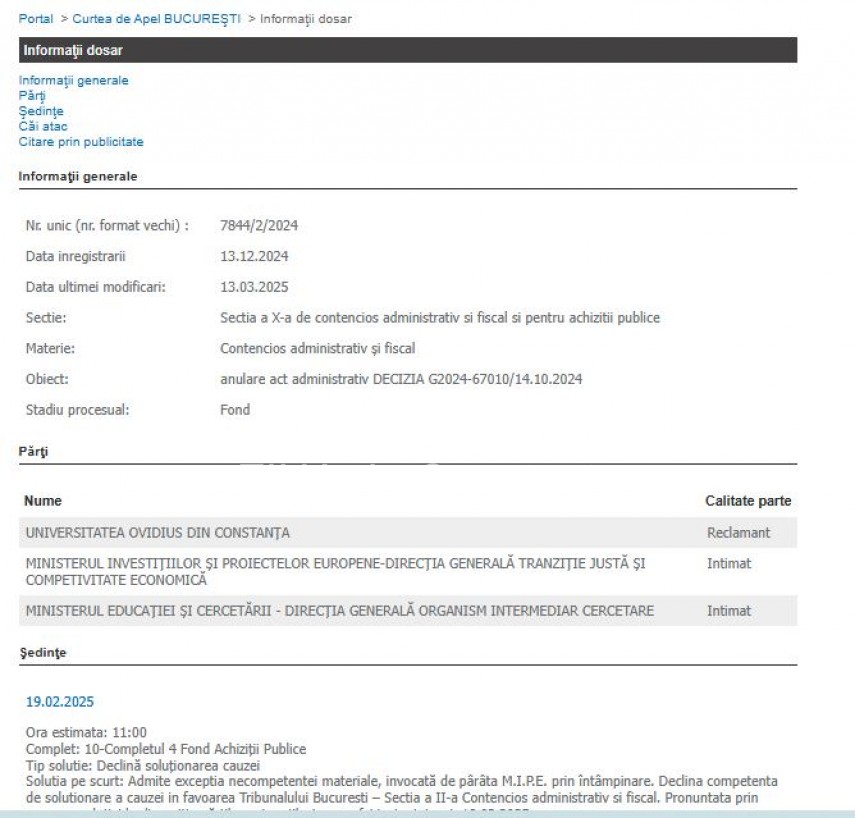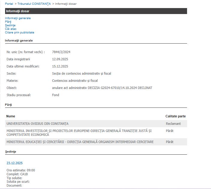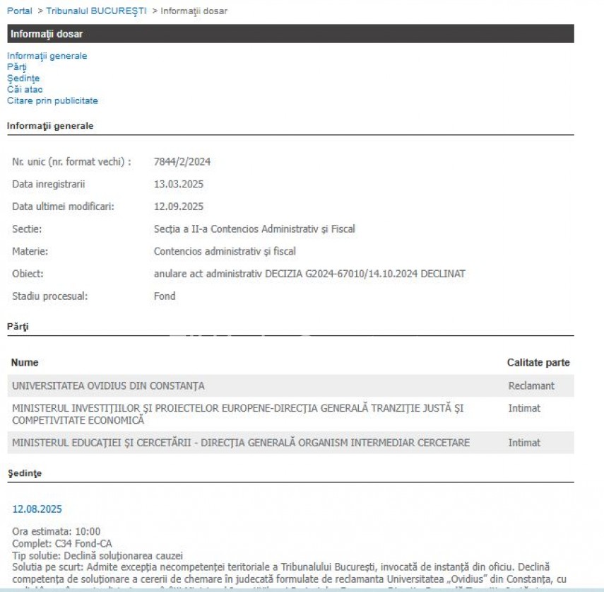 Amintim că, la data de 11 decembrie este programat la Tribunalul Constanța termen în dosarul 7844/2/2024 ce vizează litigiul administrativ deschis de Universitatea „Ovidius” din Constanța împotriva Ministerului Investițiilor și Proiectelor Europene (MIPE) și a Ministerului Educației.
