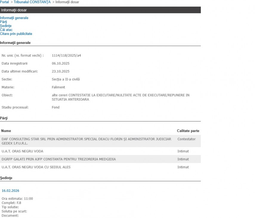 Tribunalul Constanța a stabilit când va judeca litigiul dintre Daf Consulting Star SRL cu Primăria orașului Negru Vodă, județul Constanța și DGRFP Galați prin AJFP Constanța pentru Trezoreria Medgidia, ce are ca obiect „alte cereri contestație la executare/nulitate act de executare/repunere în situația anterioară.”
