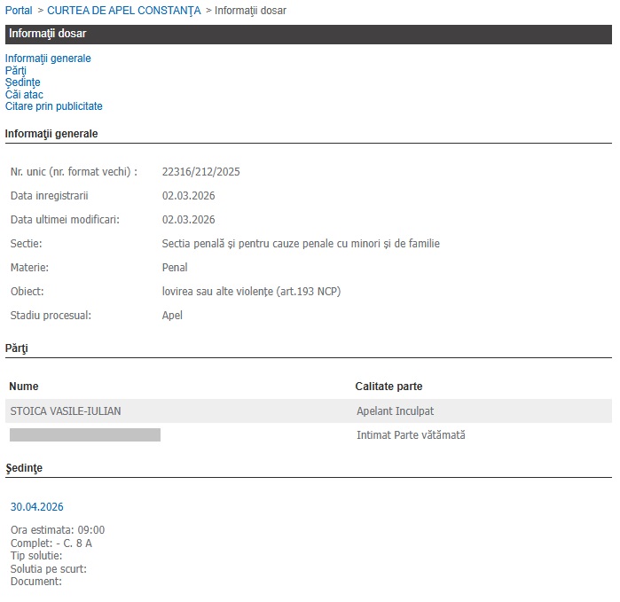 Potrivit Portalului Instanțelor de Judecată, termenul de judecată în faza apelului se va desfășura la finele lunii aprilie, anul curent.