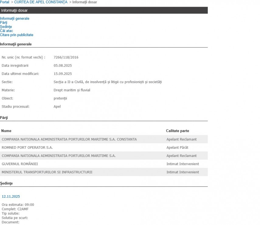 Litigiul dintre CN APM Constanța și Romned Port Operator SA privind utilizarea terenurilor portuare a fost soluționat. Urmează apelul