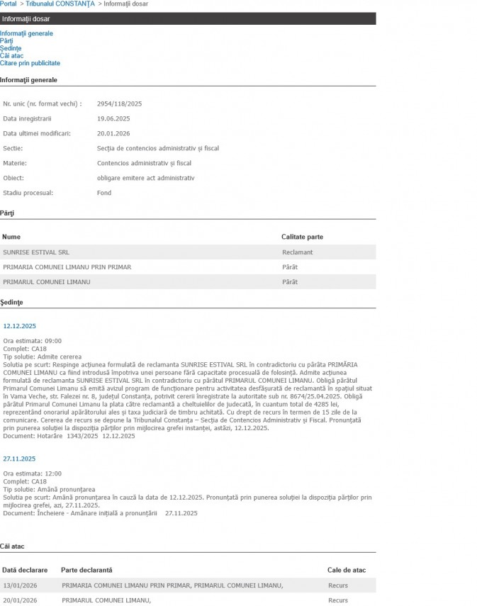 Dosarul cu indicativul 2954/118/2025 a fost înregistrat pe 19 iunie 2025 și o soluție s-a dat la termenul din 12 decembrie. Tribunalul a dispus ca edilul comunei Limanu să elibereze actul administrativ cerut de Sunrise Estival SRL.