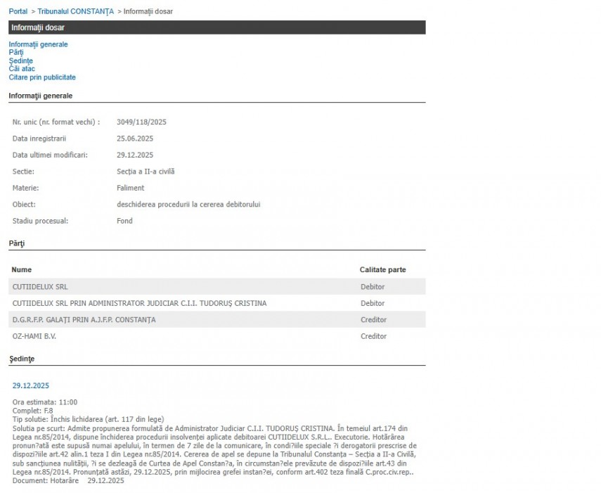 Tribunalul Constanța, prin Secția a II-a Civilă, a pronunțat astăzi, 29 decembrie 2025, soluția de închidere a procedurii insolvenței pentru societatea Cutiidelux SRL din Constanța.