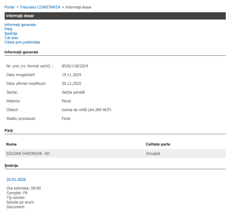 Dosarul penal în care este inculpat (nr. unic 8526/118/2024) are ca obiect infracțiunea de luare de mită, prevăzută de art. 289 Cod Penal. Următoarea ședință în acest dosar este programată pentru 5 iunie 2025, la Tribunalul Constanța.