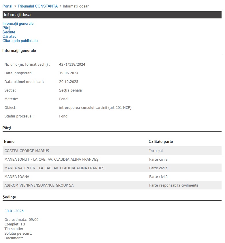 Tribunalul Constanța a anunțat un nou termen de judecată în dosarul în care medicul George Marius Costea a fost trimis în judecată, fiind acuzat de întreruperea cursului sarcinii peste termenul legal, faptă ce ar fi dus la decesul unei paciente în vârstă de 26 de ani.
