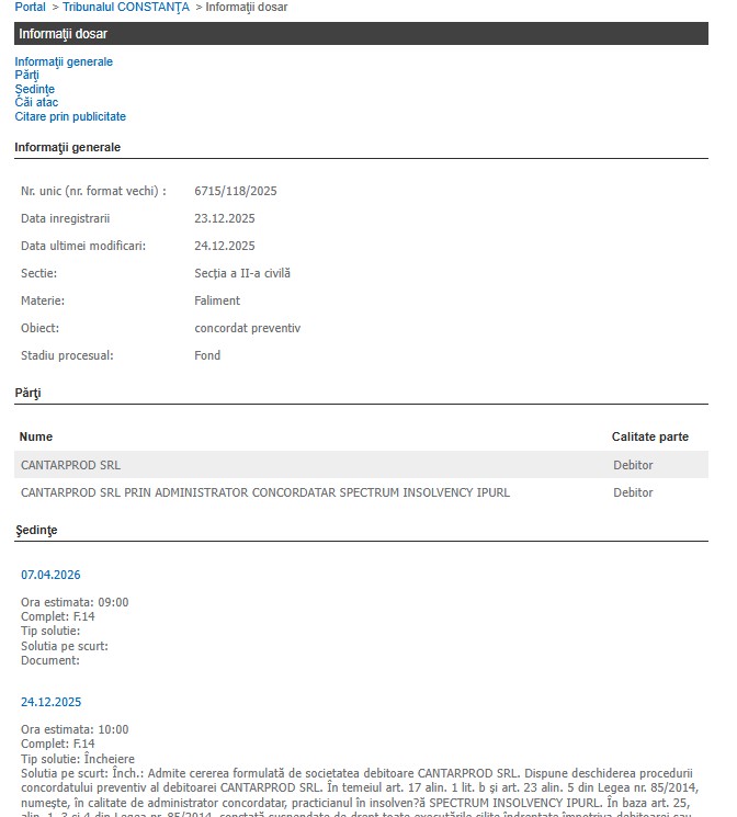 Societatea Cantarprod SRL a obținut de la Tribunalul Constanța aprobarea procedurii de concordat preventiv în dosarul 6715/118/2025.
