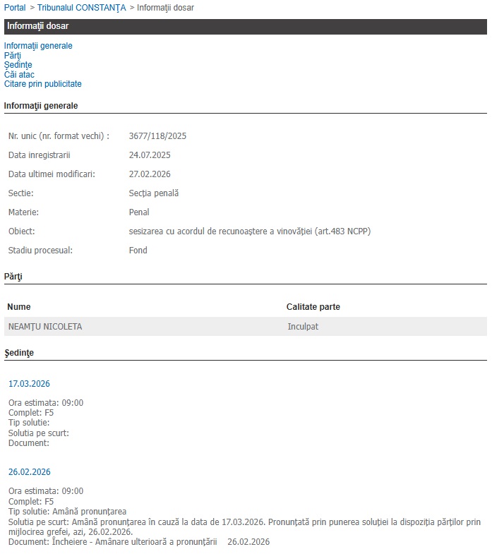 Amintim că în aceeași cauză, un acord de recunoaștere a vinovăției a fost semnat și de către inculpata Laura Iuliana Cocor, acord care a fost trimis spre soluționare Tribunalului Constanța, la data de 24.07.2025.