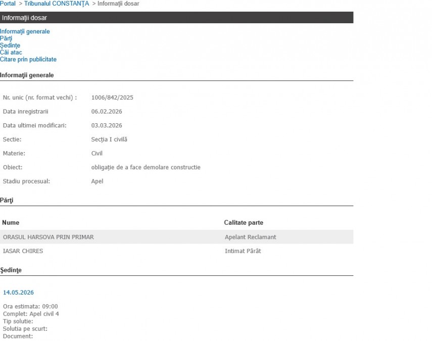 Conform datelor de pe Portal Just, completul de judecată Apel civil 4 va analiza calea de atac formulată de edilul Hârșovei.