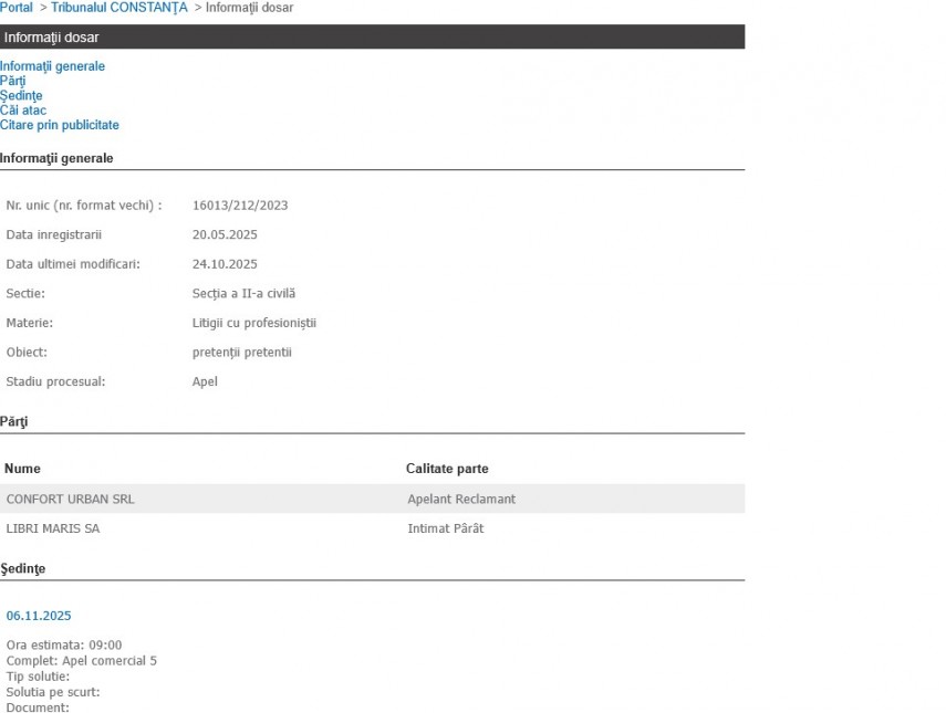 Joi, 6 noiembrie 2025, la Tribunalul Constanța are loc ședința de judecată în procesul dintre Confort Urban SRL și Libri Maris SA pentru un spațiu comercial din stațiunea Mamaia.