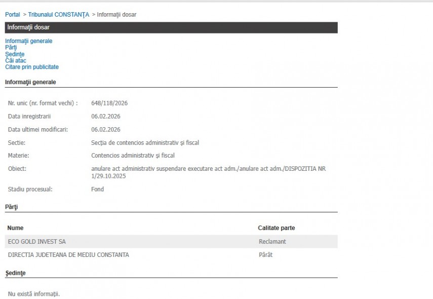 La Tribunalul Constanța se află o dispută juridică între Eco Gold Invest SA și Direcția Județeană de Mediu Constanța în care se contestă un act administrativ emis de instituția de mediu.