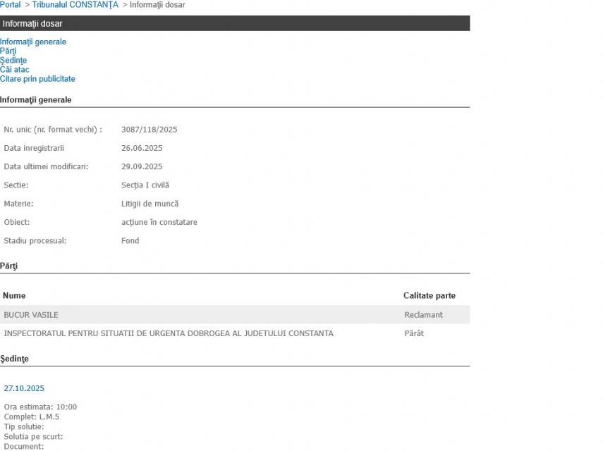 Tribunalul Constanța se va pronunța astăzi, 27 octombrie 2025, în dosarul 3087/118/2025, în care părțile sunt Bucur Vasile – reclamant și Inspectoratul pentru Situații de Urgență Dobrogea al județului Constanța – pârât.