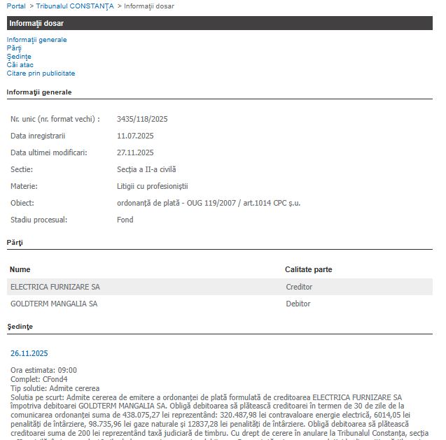 Secția a II-a civilă a admis cererea formulată de Electrica Furnizare SA într-un litigiu privind emiterea unei ordonanțe de plată împotriva Goldterm Mangalia SA în dosarul 3435/118/2025, înregistrat la data de 11 iulie 2025 la Secţia a II-a Civilă, ce are ca obiect „ ordonanţă de plată - OUG 119/2007 / art.1014 CPC ş.u. “