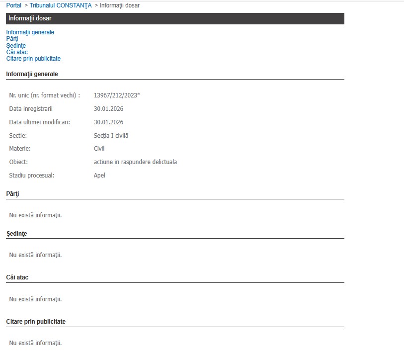 Pe rolul Tribunalului Constanța, a fost înregistrat dosarul 13967/212/2023, care are ca obiect „acțiune în răspundere delictuală”.Dosarul a ajuns pe masa magistraților la data de 30.01.2026 pe secția I civilă, stadiul procesual fiind apel.