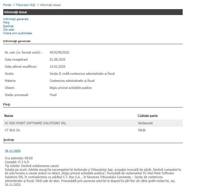 Un litigiu important privind achizițiile publice, declanșat de societatea SC Red Point Software Solutions SRL împotriva operatorului de transport public CT BUS SA, va fi soluționat de magistrații de la Tribunalul Constanța. Dosarul a ajuns pe rolul instanței constănțene după ce Tribunalul Iași și-a declinat competența teritorială.