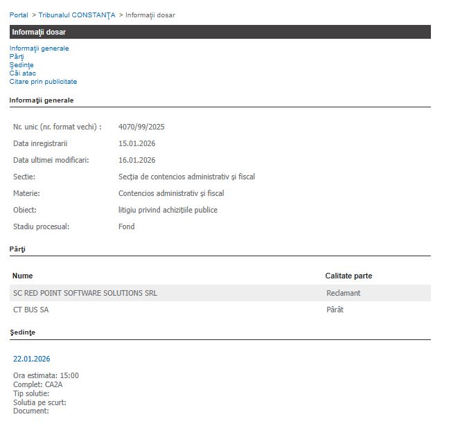 Obiectul dosarului 4070/99/2025 vizează un litigiu privind achizițiile publice, o materie sensibilă care privește contractele de furnizare sau servicii încheiate de compania de transport public. După parcurgerea etapelor procedurale de transfer, dosarul a fost înregistrat oficial la Constanța pe data de 15 ianuarie 2026.