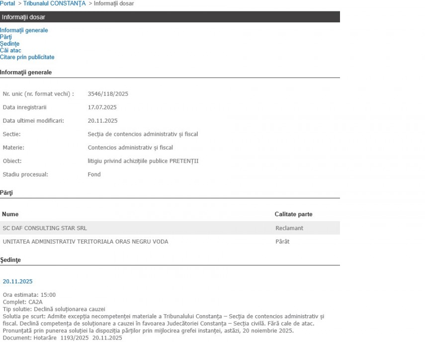 Ieri, 20 noiembrie a.c., a avut loc al doilea termen în dosarul 3546/118/2025 în care Daf Consulting Star SRL a dat în judecată Primăria orașului Negru Vodă.