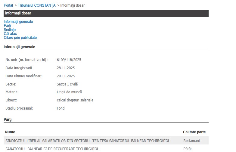 Pe rolul Tribunalului Constanța se află dosarul cu nr. 6109/118/2025, la Secţia I civilă, cu obiectul „calcul drepturi salariale”, stadiul procesual fiind de fond.