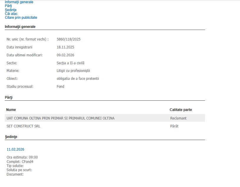 Părți în dosar sunt UAT Comuna Oltina prin primar și primarul Comunei Oltina, în calitate de reclamant și Set Construct SRL, în calitate de pârât.
