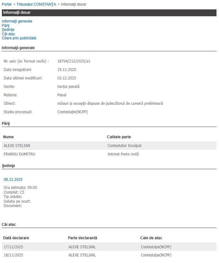 Ulterior, la data de 14.11.2025, judecătorul de cameră preliminară a stabilit începerea judecății în baza rechizitoriului întocmit de Parchetul de pe lângă Tribunalul Constanța.