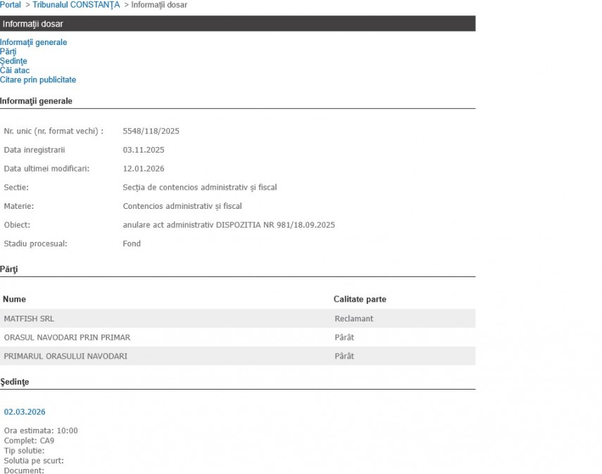 - Tribunalul Constanța a fixat data de 2 martie 2026 pentru judecarea litigiului ce are ca obiect anularea dispoziției nr. 981/18.09.2025 emisă de edilul orașului Năvodari