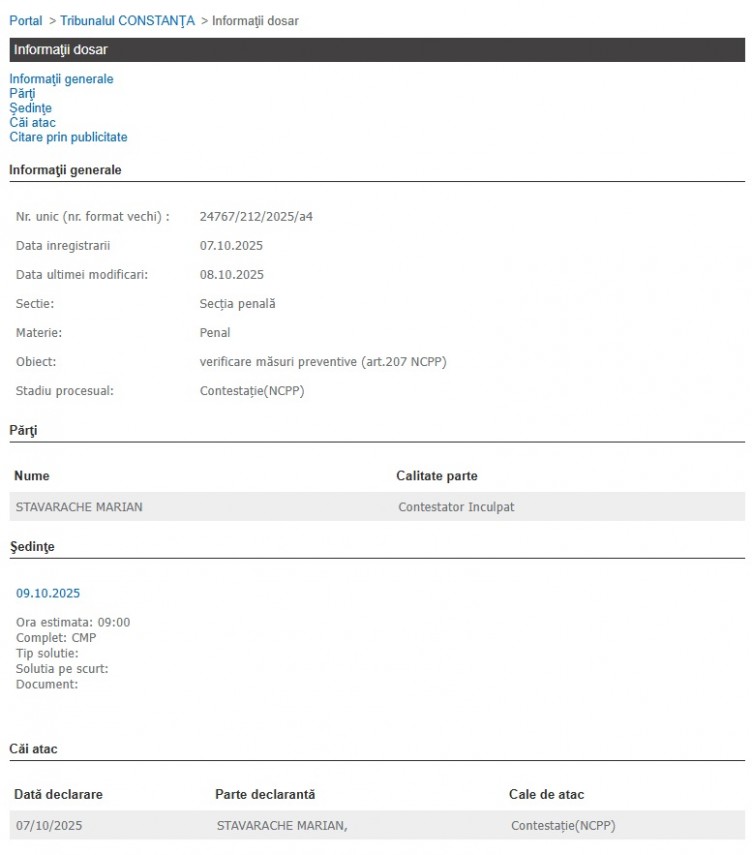Astfel, porivit Portalului Instanțelor de Judecată, Marian Stavarache, cercetat în dosarul de tâlhărie calofocată și alte infracțiuni asociate, cu indicativul 24767/212/2025, va afla dacă va rămâne sau nu după gratii.