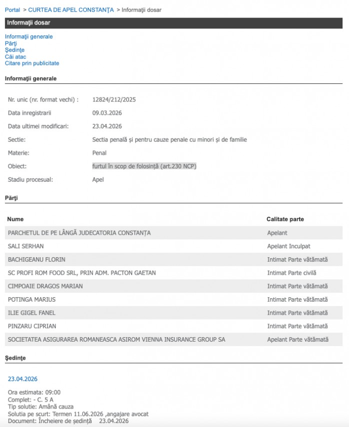 După ce Sali Serhan a fost deferit în dosarul cu indicativul 12824/212/2025, care are ca obiect furtul în scop de folosinţă (art.230 NCP), la data de 10 februarie anul curent, acesta a primit la Judecătoria Constanța o pedeapsă de 3 ani și 6 luni de închisoare, în regim de detenție.