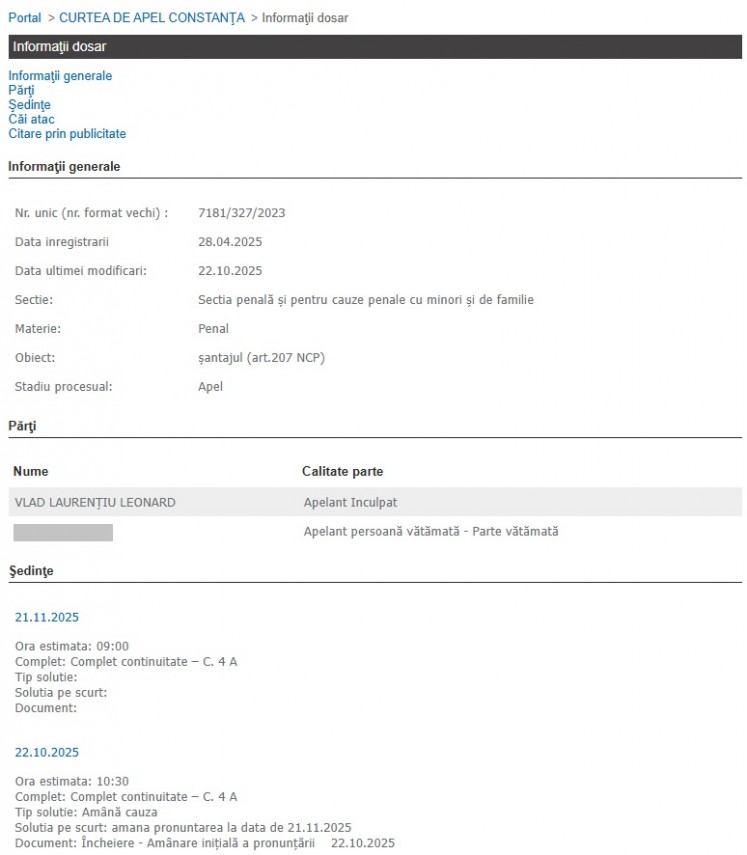 Hotărârea a fost atacată cu apel atât de inculpat, cât și de persoana vătămată, iar cazul a intrat în atenția Curții de Apel Constanța, care la data de, 10.10.2025, a repus cauza pe rol și a hotărât punerea în dezbatere a schimbării încadrării juridice a faptelor reținute în sarcina acestuia!