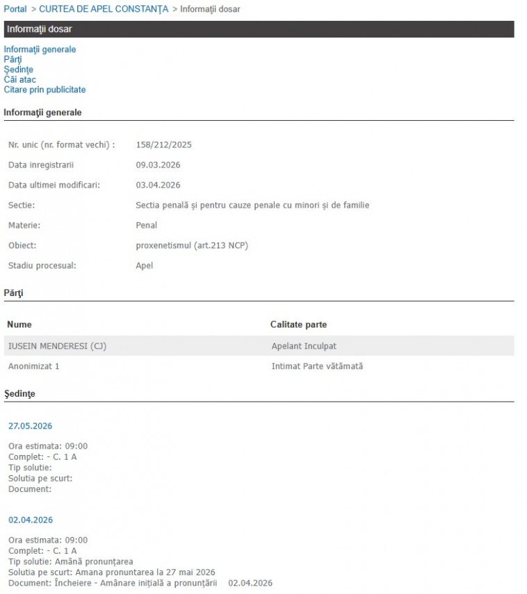 După ce Iusein Menderesi a fost deferit justiției în dosarul cu indicativul 158/212/2025, la data de 9 februarie 2026, a primit prima condamnare la Judecătoria Constanța.