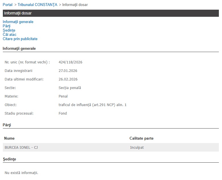 Dosarul cu numărul unic 424/118/2026 a fost înregistrat oficial la data de 27 ianuarie 2026 pe secția Penală a Tribunalului Constanța. Potrivit datelor publice, procesul se află în stadiul de Fond, fiind vizate fapte prin care inculpatul ar fi pretins, primit ori acceptat promisiunea de bani sau alte foloase, susținând că are influență asupra unui funcționar public.