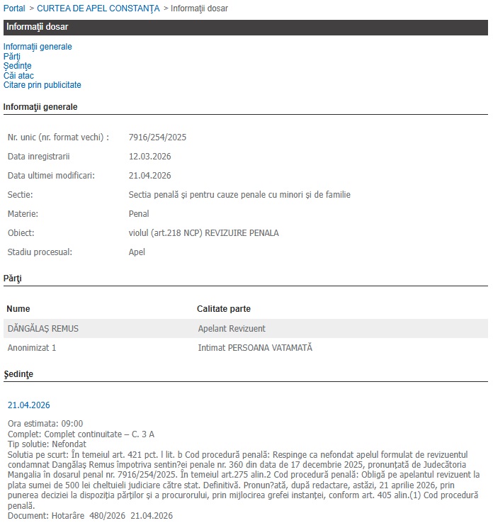 În dosarul nr. 7916/254/2025, înregistrat inițial pe rolul Judecătoriei Mangalia, Dăngălaș a solicitat revizuirea hotărârii prin care a fost condamnat pentru infracțiunea de viol (art. 218 NCP). După ce prima instanță i-a respins cererea în decembrie anul trecut, apelul acestuia a ajuns pe masa judecătorilor de la Curtea de Apel Constanța.