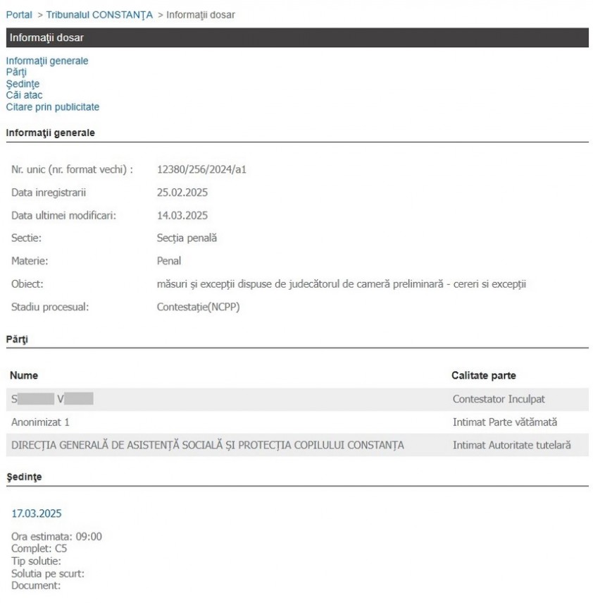 Potrivit portalului instanțelor de judecată, Judecătoria Medgidia ar fi stabilit, la începutul lunii februarie, anul curent, ca S.V. să rămână după gratii pentru încă 30 de zile, însă măsura a fost contestată de suspect.