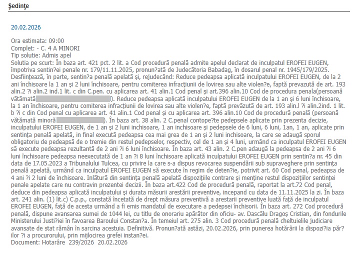 Soluția instanței de fond a fost atacată de inculpat, iar dosarul a ajuns, astfel, pe masa magistraților Curții de Apel Constanța, care, vineri, 20.02.2026, s-au pronunțat în cauză.