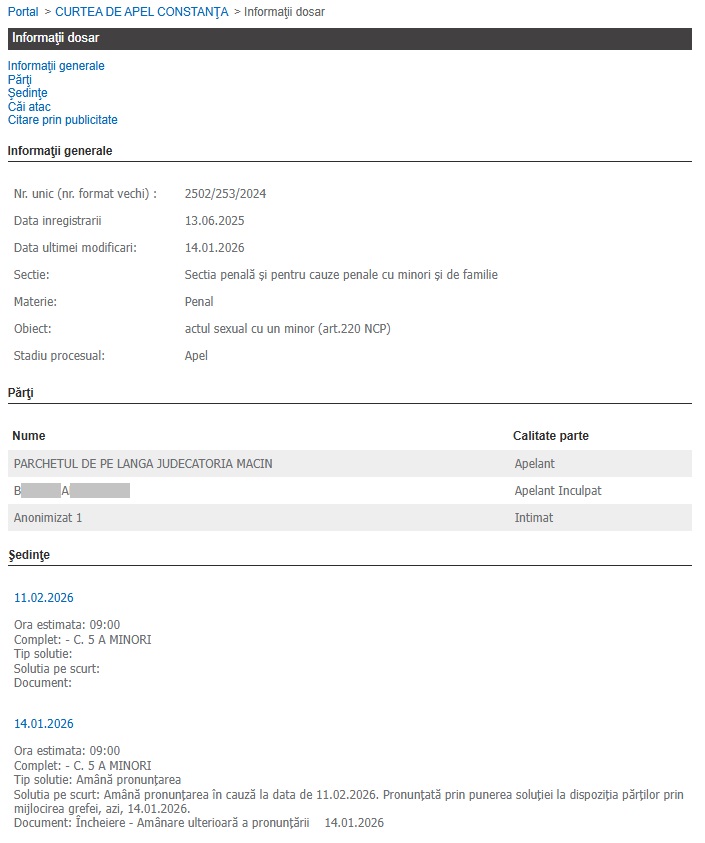 După ce bărbatul ar fi primit o primă condamnare la Judecătoria Măcin, potrivit portalului instanțelor de judecată, atât inculpatul, cât și Parchetul de pe lângă Judecătoria Măcin ar fi depus o contestație la Curtea de Apel Constanța, față de care magistrații ar putea să se pronunțe la începutul lunii februarie, anul curent.