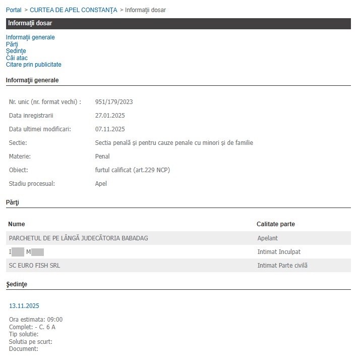 Ultimul termen în apel a fost stabilit pentru luni, 13.11.2025, dată la care va fi audiat un martor.