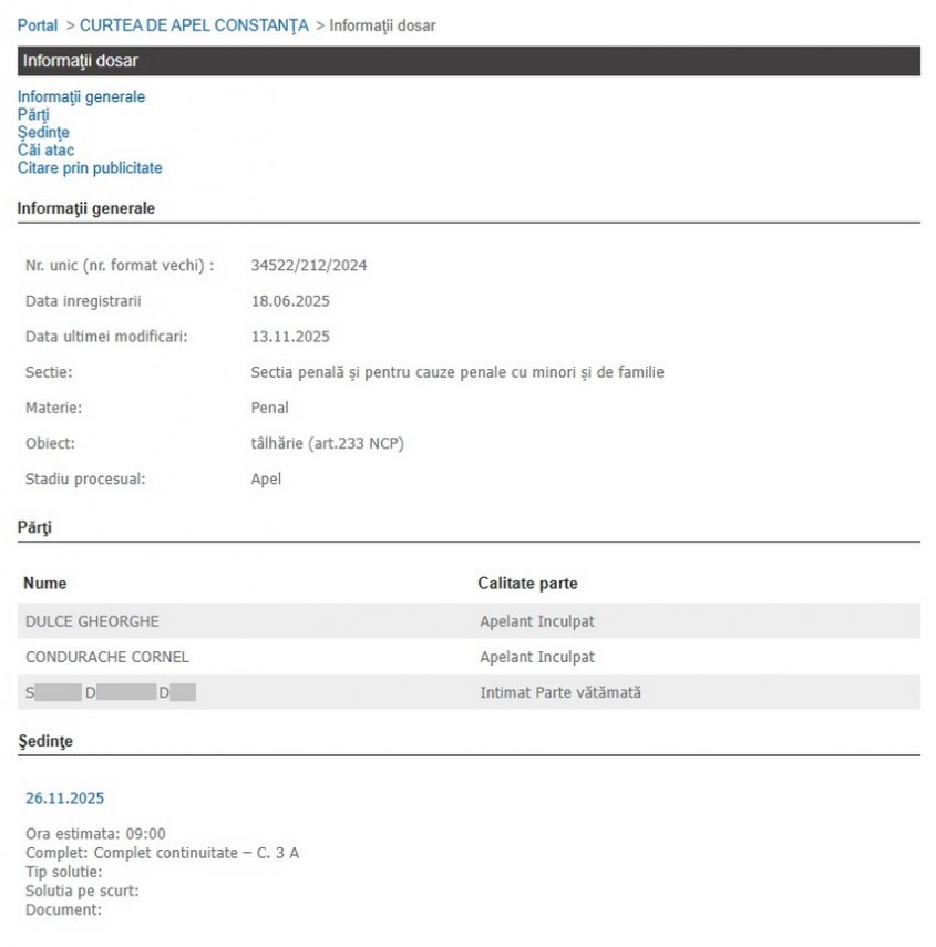 În cauză, ambii inculpați au contestat soluția judecătoriei, soluționarea cauzei ajungând în sarcina Curții de Apel Constanța, instanță care, la termenul din octombrie, anul curent, a suspendat cauza. Aceeași instanță a stabilit ca următorul termen de judecată să se desfășoare aproape de finele lunii noiembrie 2025.