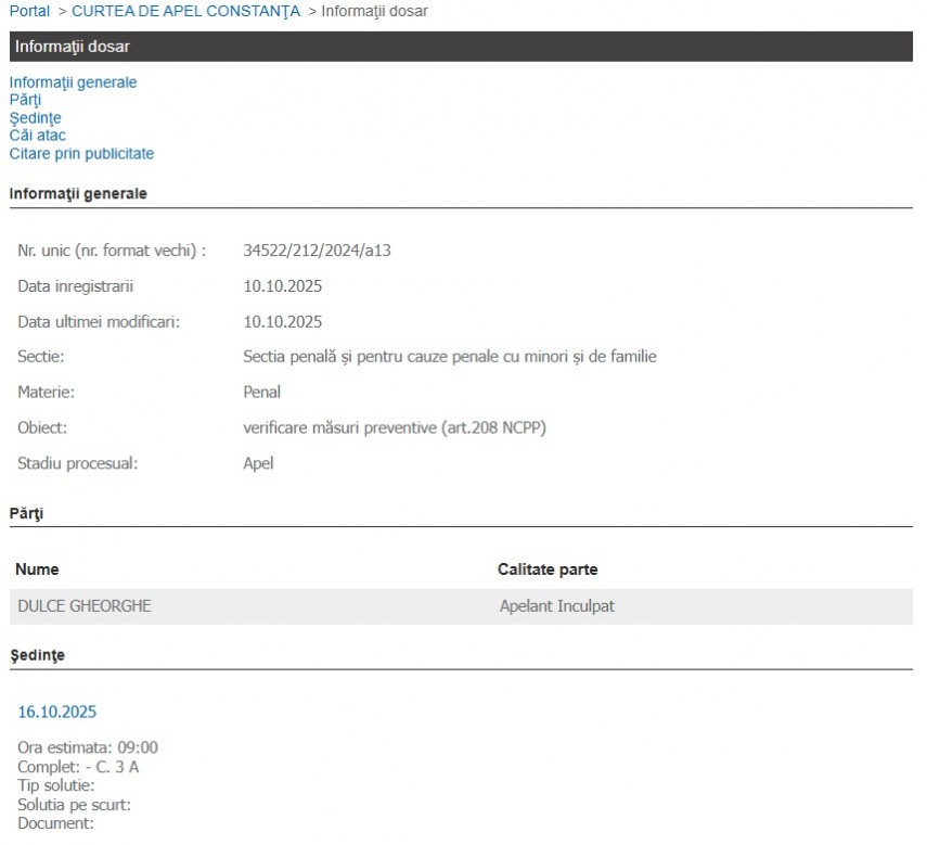 Cei doi suspecți au fost deferiți justiției, iar potrivit portalului instanțelor de judecată, până la acest moment, Dulce Gheorghe este cercetat în stare de arest preventiv. În privința măsurilor preventive, acesta a fost citat la Curtea de Apel, marți, 16.10.2025.