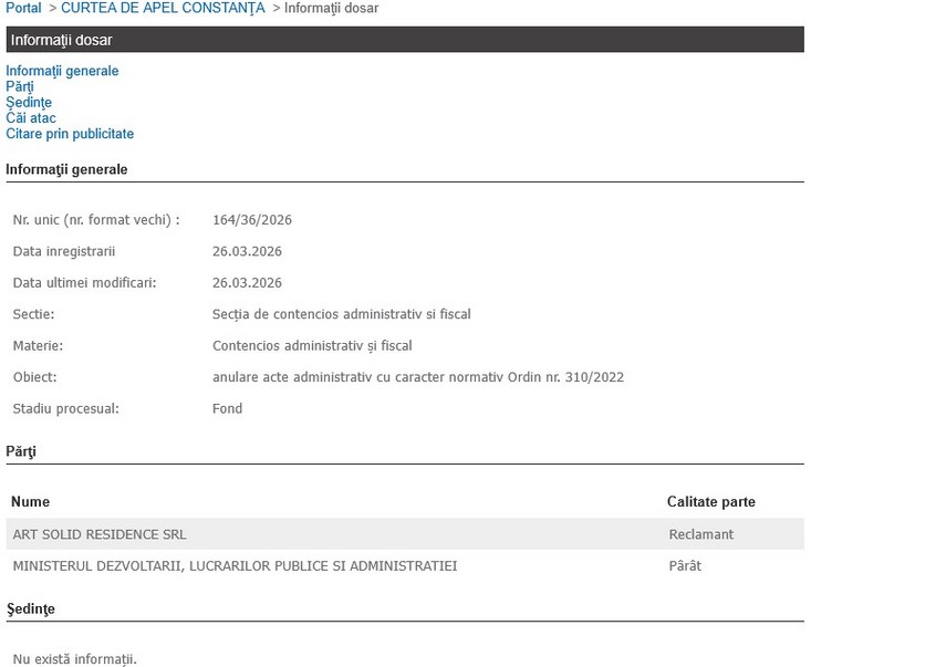 Firma Art Solid Residence SRL, dezvoltator imobiliar din Constanța, a deschis o acțiune la Curtea de Apel Constanța împotriva Ministerului Dezvoltării, Lucrărilor Publice și Administrației.