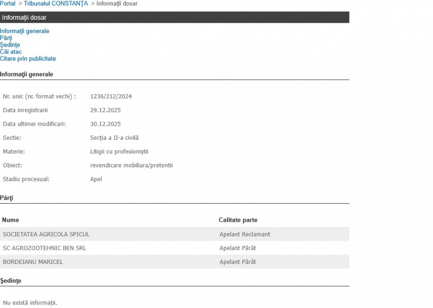 Pe rolul Tribunalului Constanța a ajuns, în data de 29 decembrie 2025, dosarul 1236/212/2024, aflat în stadiul de apel.