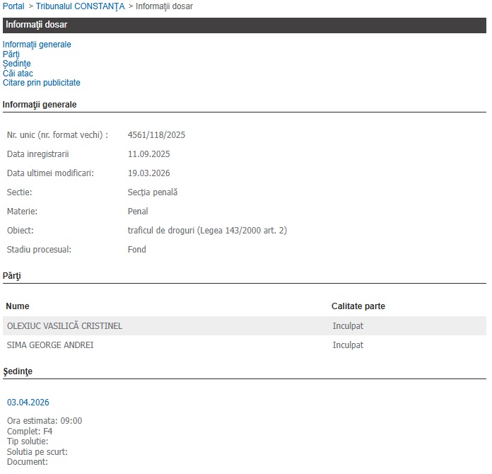 Potrivit Portalului Instanțelor de Judecată, cei doi au fost deferiți justiției în dosarul cu indicativul 4561/118/2025, înregistrat pe Secția Penală a Tribunalului Constanța, în care judecata a fost programată să înceapă la data de 3 aprilie, anul curent.