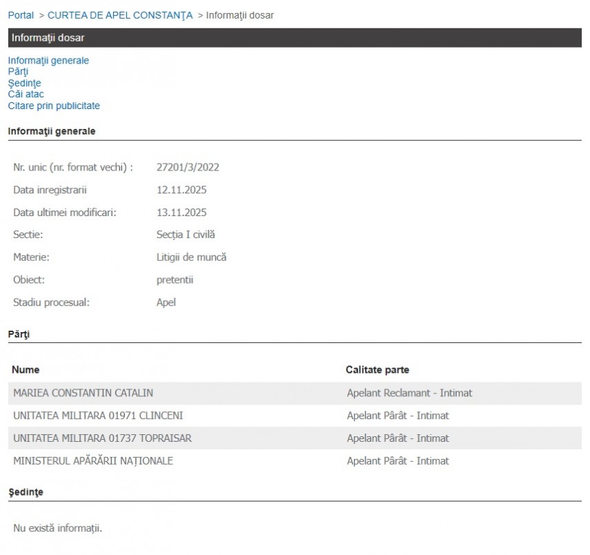 Curtea de Apel Constanța va soluționa cauza unui militar care a chemat în instanță Ministerul Apărării Naționale și Unitățile Militare 01971 și 01737, într-un dosar care are ca obiect „pretenții”.