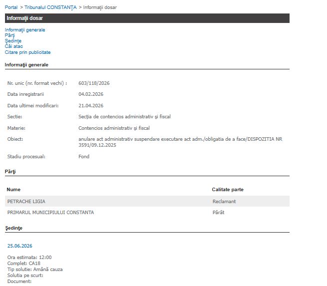 Azi, 23 aprilie, este termen în dosarul(603/118/2026) dintre Petrache Ligia și primarul municipiului Constanța.