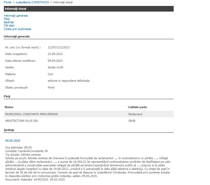 Procesul se află în prezent în stadiul de apel, după ce cauza a fost înregistrată la Tribunal în septembrie 2025. Primăria Constanța are calitatea de intimat-reclamant, în timp ce firma de arhitectură deține calitatea de apelant-pârât, contestând decizia primei instanțe.