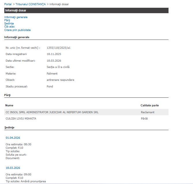 Un nou termen în dosarul de insolvență al firmei Nefertum Garden SRL din Constanța