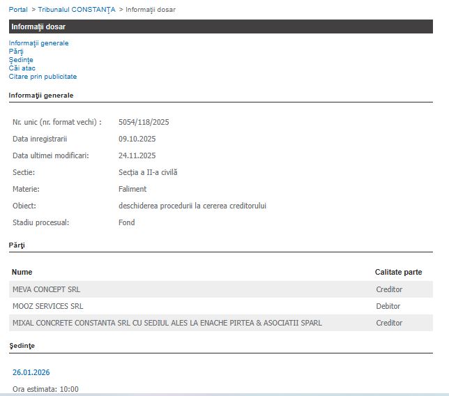 Anul 2026 vine cu un termen în dosarul unde MEVA Concept SRL cere deschiderea procedurii de insolvență împotriva Mooz Services SRL din Constanța.
