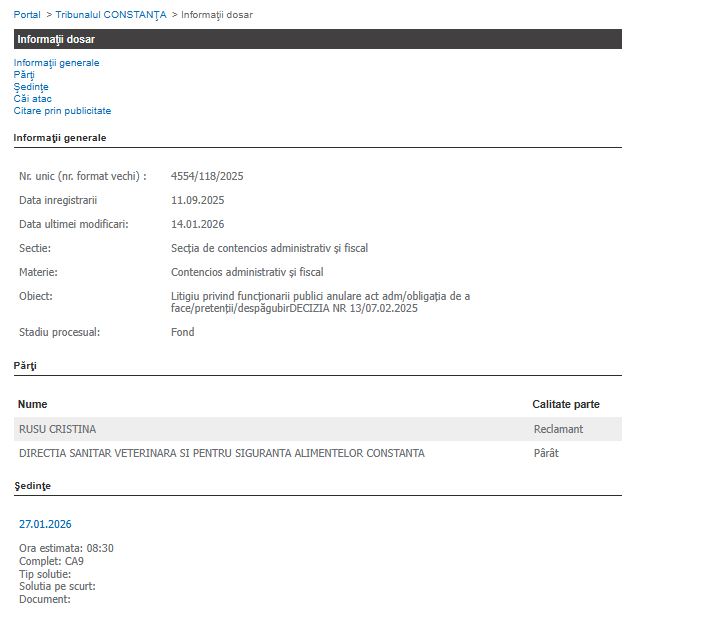 Cristina Rusu, fost consilier superior la Direcția Sanitar-Veterinară și pentru Siguranța Alimentelor Constanța, a deschis un proces în contencios administrativ și fiscal împotriva instituției, înregistrat la data de 11 septembrie 2025, sub numărul 4554/118/2025.