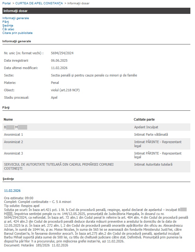 Instanța superioară a anunțat în cursul zilei de miercuri, 11.02.2026, că apelul inculpatului a fost respins, fapt pentru care va rămâne valabilă sentința primei instanțe.