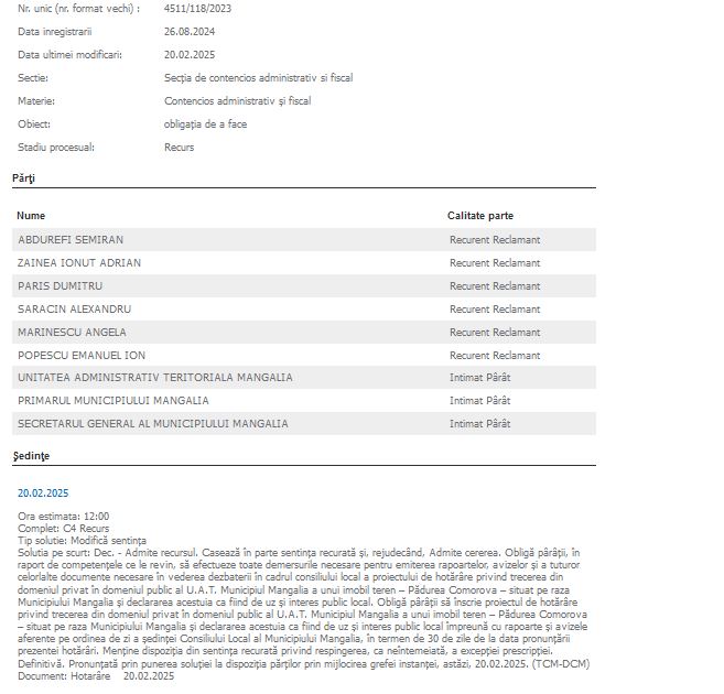 Iată soluția pe scurt: „Admite recursul. Casează în parte sentinţa recurată şi, rejudecând, Admite cererea. Obligă pârâţii, în raport de competenţele ce le revin, să efectueze toate demersurile necesare pentru emiterea rapoartelor, avizelor şi a tuturor celorlalte documente necesare în vederea dezbaterii în cadrul consiliului local a proiectului de hotărâre privind trecerea din domeniul privat în domeniul public al U.A.T. Municipiul Mangalia a unui imobil teren – Pădurea Comorova – situat pe raza Municipiului Mangalia şi declararea acestuia ca fiind de uz şi interes public local. Obligă pârâţii să înscrie proiectul de hotărâre privind trecerea din domeniul privat în domeniul public al U.A.T. Municipiul Mangalia a unui imobil teren – Pădurea Comorova – situat pe raza Municipiului Mangalia şi declararea acestuia ca fiind de uz şi interes public local împreună cu rapoarte şi avizele aferente pe ordinea de zi a şedinţei Consiliului Local al Municipiului Mangalia, în termen de 30 de zile de la data pronunţării prezentei hotărâri. Menţine dispoziţia din sentinţa recurată privind respingerea, ca neîntemeiată, a excepţiei prescripţiei. Definitivă. Pronunţată prin punerea soluţiei la dispoziţia părţilor prin mijlocirea grefei instanţei, astăzi, 20.02.2025. (TCM-DCM)