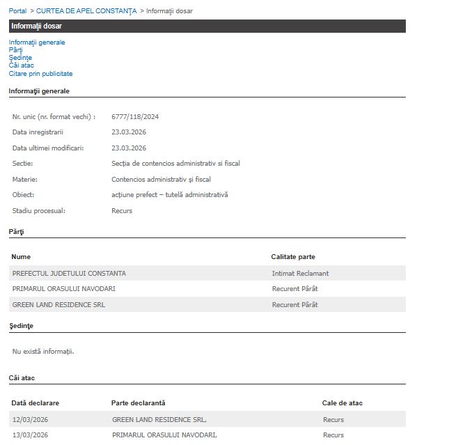 Decizia Tribunalului nu este încă definitivă. Atât Primarul Orașului Năvodari, cât și dezvoltatorul imobiliar Green Land Residence SRL au atacat hotărârea cu recurs în luna martie 2026.