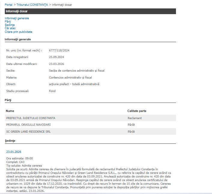 Urbanism la Năvodari Tribunalul anulează autorizația pentru Green Land Residence SRL după acțiunea Prefectului. Dosarul a ajuns la Curtea de Apel