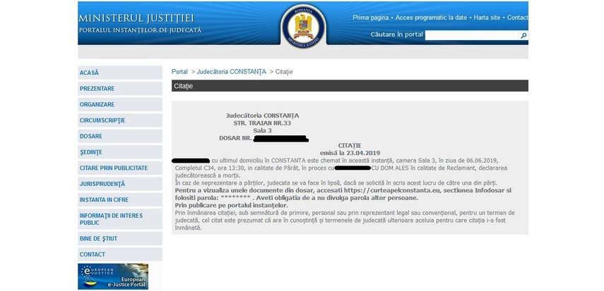 În paralel cu aceste demersuri efectuate prin instanță, femeia dispărută a fost citată, conform procedurii în vigoare, la ultimul domiciliu cunoscut, citația fiind publicată inclusiv într-un ziar de largă circulație, dar și pe Portalul Instanțelor de Judecată (foto). De asemenea, tot în conformitate cu legislația în vigoare, cererea de chemare în judecată a fost afișată la ultimul domiciliu cunoscut al femeii, la sediul primăriei și la sediul instanței.